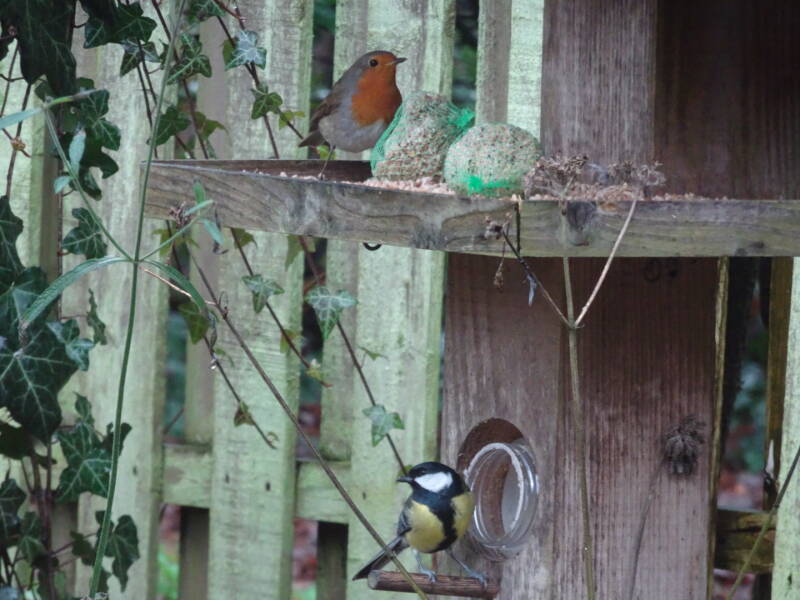 Koolmees en Roodborst samen.